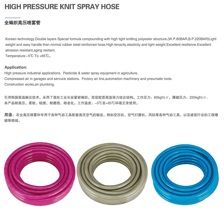 用途:農業(yè)高壓噴霧和專(zhuān)用于各種氣動(dòng)工具配套高壓空氣的輸送,例如空壓機、空氣打磨機、風(fēng)鉆等各種氣動(dòng)工具。以及建筑行業(yè)的工程爆破等領(lǐng)域。