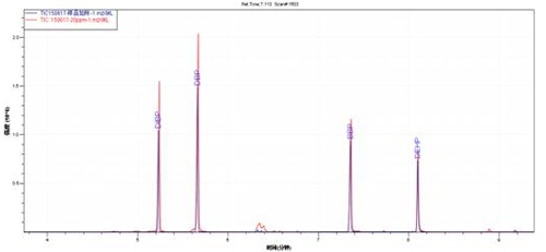 樣品加標TIC圖(藍色)與鄰苯混標TIC圖(紅色)
