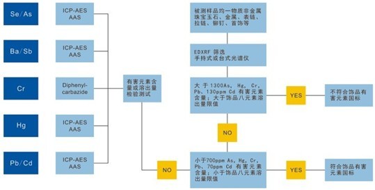 另外XRF由于只是測試元素的總含量,而無(wú)法進(jìn)行溶出量的檢測,我們可以通過(guò)XRF測試元素總量是否超過(guò)了溶出量最大限量,如果超過(guò)溶出量最大限量,則必須通過(guò)其他光譜分析檢測設備(如ICP、AAS)來(lái)確定元素的溶出量是否超過(guò)了最大限量,所以如果要全方位的解決飾品中有害元素檢測解決方案,單只靠XRF是無(wú)法全部做到的,還要進(jìn)行其它分析測試,下圖表示XRF檢測飾品有害元素的篩選性初檢分析方法: