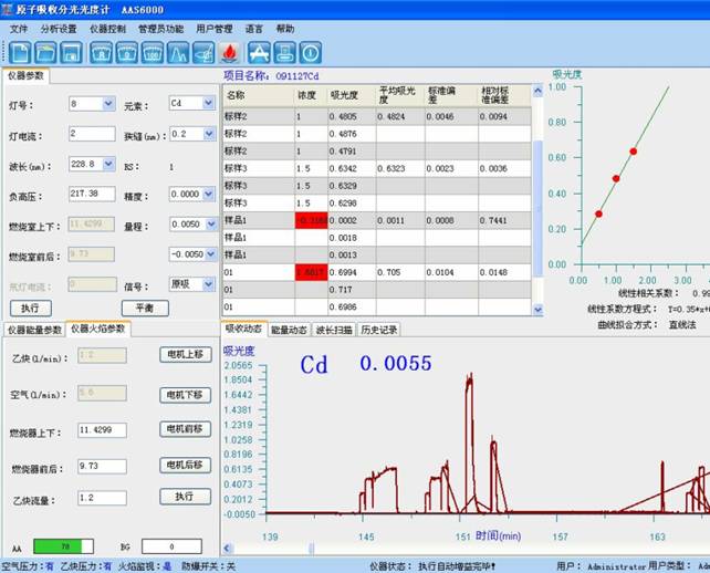 于原子吸收光譜儀 228.8 nm 處,使用空氣-乙炔貧燃火焰,以水調零,測量試液的吸光度,減去隨同試料的空白試驗溶液的吸光度,從工作曲線(xiàn)上查出相應的鎘濃度。