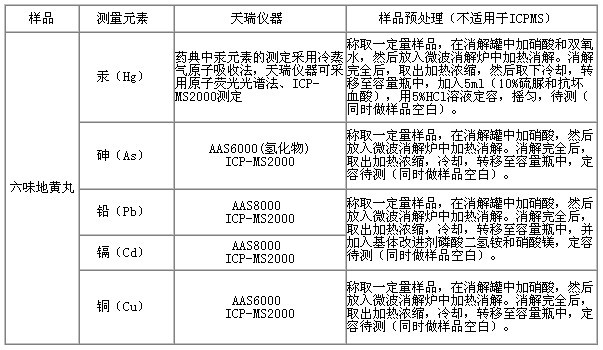 天瑞儀器參考《中華人民共和國藥典》,采用原子吸收光譜儀(AAS6000;AAS8000)、原子熒光光譜儀(AFS200系列)、電感耦合等離子體質(zhì)譜儀(ICP-MS2000),對六味地黃丸中鎘、鉛、銅、砷、砷、汞等重金屬的測定進(jìn)行研究,測試結果準確度高,重復性好。