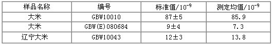 選用三種國家標準大米樣品進(jìn)行樣品消解及樣品測試,測試結果如表1所示: