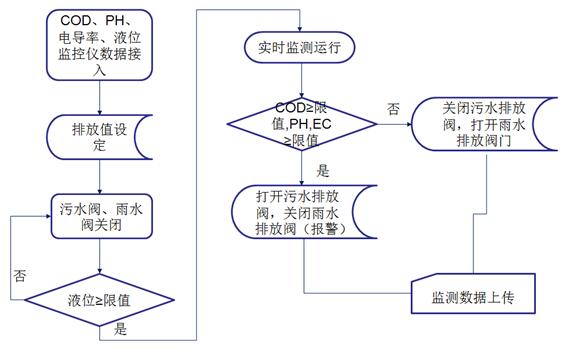 監測系統控制采樣單元將水樣導入監測室,并啟動(dòng)監測水質(zhì)的COD、pH、電導率等常規參數。達標雨水通過(guò)電控閥門(mén)排入市政雨水管網(wǎng),一旦超標電控閥門(mén)關(guān)閉,禁止雨水排入市政雨水管網(wǎng),并通過(guò)水泵將超標雨水泵入企業(yè)污水處理系統處理,達標后排放至市政污水管網(wǎng)。同時(shí)所有監測數據經(jīng)由數據采集單元將數據統計后,由傳輸設備傳輸至企業(yè)監測中心或環(huán)保局,由此完成對雨水排放自動(dòng)、實(shí)時(shí)、連續監控。