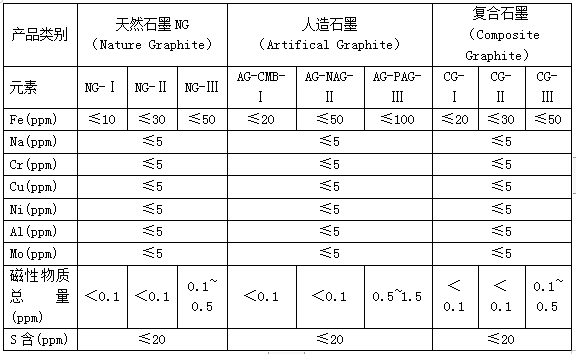 表1:不同類(lèi)別的鋰離子電池石墨類(lèi)負極材料的元素含量限定技術(shù)指標