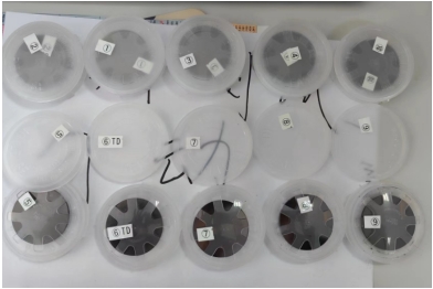 按照石墨取樣標準,取100g石墨樣品,在105℃的干燥箱干燥2h。稱(chēng)量10.0g石墨樣品和2.0g硬脂酸(分析純)于粉碎機中振動(dòng)研磨30s,將石墨樣品粉碎至0.074mm及以下。稱(chēng)量3.0g石墨樣品和12.0g硼酸粉末,以硼酸粉末為填充劑,在30T壓力保壓30s的條件下壓片成型。然后,在樣片上面貼上標簽、放入樣品袋中,待用。