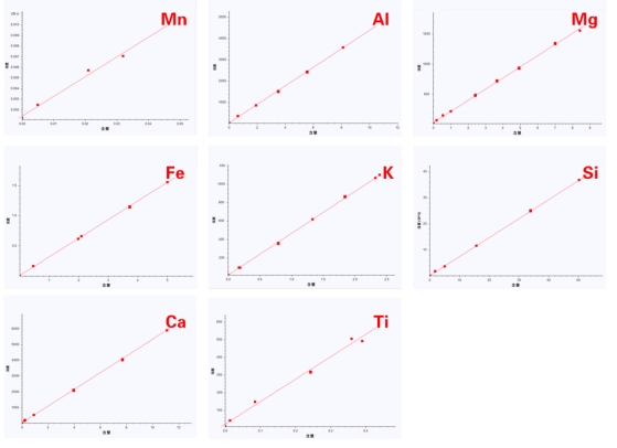 設定適當的測量條件,使用X射線(xiàn)熒光光譜儀掃描一系列含量已知的石墨標準物質(zhì)或石墨二次標樣,該系列樣品中需關(guān)注元素Mg、Al、Si、K、Ca、Ti、Mn、Fe等元素含量與強度的一次線(xiàn)性校正工作曲線(xiàn)。然后,對未知石墨樣品進(jìn)行測量。
