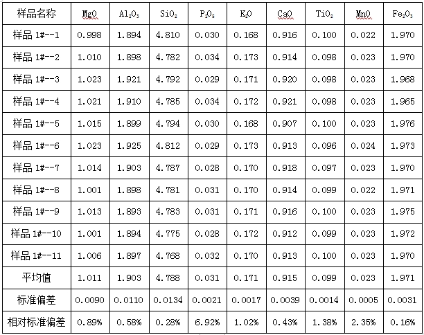 圖3為石墨1#樣品的X射線(xiàn)熒光譜圖,從譜圖可知,樣品的含有少量Mg、Al、Si、P、K、Ca、Ti、Mn、Fe等元素。使用該樣品進(jìn)行重復性測試之后,檢測結果中計算了對應元素的氧化物含量,測試結果中呈現出較好的重復性。