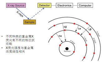 X射線(xiàn)熒光光譜技術(shù)(XRF)的原理見(jiàn)圖3所示,可以直接檢測固體或液體樣品中ppm量級的元素成分。采用富集后再檢測的辦法,使得XRF技術(shù)對空氣顆粒物中的重金屬成分的檢測限優(yōu)于0.001ug/m3。而常規實(shí)驗室的檢測技術(shù),由于預處理消解過(guò)程中需要將微克量級的樣品溶解到幾十克的液體中,而使得濃度被稀釋百萬(wàn)倍,從而多數儀器(譬如ICP-AES、或原子吸收光譜儀)無(wú)法檢出元素含量低于10ug/m3量級的空氣顆粒物樣品。