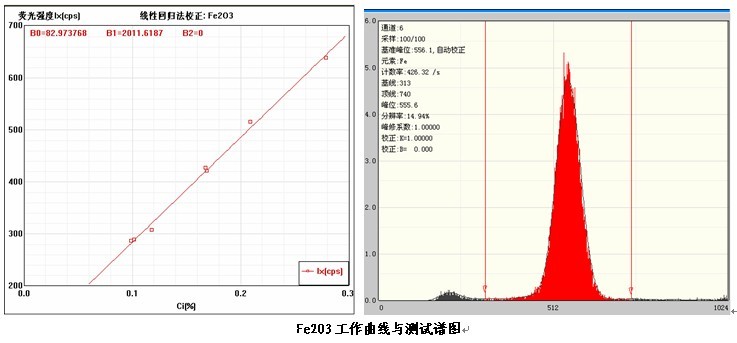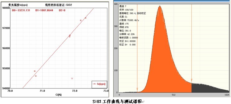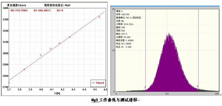 各個(gè)元素的工作曲線(xiàn)與測試譜圖,其中B0為曲線(xiàn)節距;B1:為曲線(xiàn)斜率;在測試譜圖中有元素的測試信息:計數率,采樣時(shí)間,分辨率等。