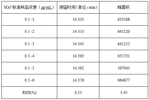 取0.5μg/L硫酸根標準溶液重復進(jìn)樣6次,考察保留時(shí)間和峰面積的重復性,RSD結果詳見(jiàn)表3。