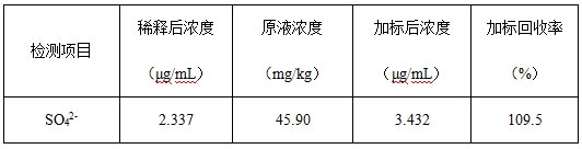 按照硫酸根各濃度點(diǎn)依次進(jìn)樣,計算其峰面積,以濃度和峰面積繪制標準曲線(xiàn),線(xiàn)性相關(guān)系數為0.99996,結果詳見(jiàn)圖1。