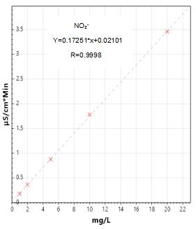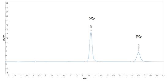 4.亞硝酸鹽及硝酸鹽測試曲線(xiàn)譜圖詳見(jiàn)圖3-1、3-2,標準樣品譜圖及實(shí)際樣品加標測試的譜圖見(jiàn)圖4-1、4-2。