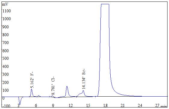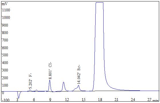 準確稱(chēng)取0.2g(精確至0.0001g)試樣,采用氧彈燃燒后冷卻定容,經(jīng)0.22μm的水系濾膜過(guò)濾后上機得到測試譜圖如下圖2、圖3所示。