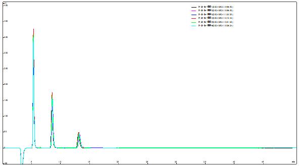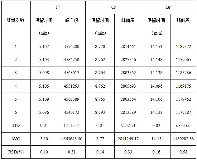 取2.0μg/mL F-、Cl-、Br-混合標準標準溶液重復進(jìn)樣6次,考察保留時(shí)間和峰面積的重復性,詳見(jiàn)圖4;其中保留時(shí)間(tR)相對偏差在0.10%-0.16%之間,峰面積(S)的相對標準偏差在0.38%~0.53%之間,重復性結果詳見(jiàn)表1。