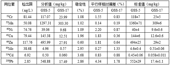 在優(yōu)化的儀器工作參數下,建立標準溶液工作曲線(xiàn)(線(xiàn)性相關(guān)系數達0.999以上),再分別取待測溶液上清液上機測試。其中:取兩個(gè)平行樣測試結果的平均值為分析值;對樣品空白溶液平行測定11次,計算11次測試結果的SD,以3×SD/k(k為標準溶液工作曲線(xiàn)的斜率)對應的值為方法檢出限。取一份GSS-17樣品溶液進(jìn)行穩定性考查,即間隔2min采集一個(gè)數據,連續采集7組數據,計算7組數據的RSD,作為穩定性指標。所得實(shí)驗數據見(jiàn)表4。