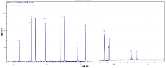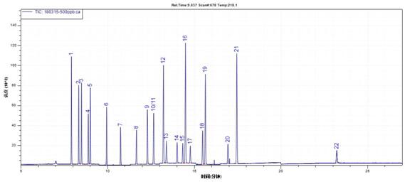 1. α-六六六;2. β-六六六;3. γ-六六六;4. -D10(內標);5. δ-六六六;6. 七氯;7. 艾氏劑;8. 環(huán)氧七氯B;9. γ-氯丹;10. 硫丹I;11. α-氯丹;12. 4,4'-DDE;13. 狄氏劑; 14. 異狄氏劑;15. 硫丹 II;16. 4,4'- DDD; 17. 異狄氏醛;18. 硫丹硫酸酯;19. 4,4'-DDT;20. 異狄氏酮; 21. 甲氧DDT;22. -D12(替代物);