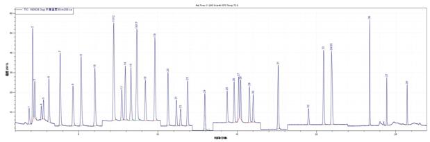 1. 四氯間二甲苯(替代物);2. -d10(內標物);3. PCB 28;4. PCB 52;5. PCB 101;6. PCB81;7. PCB 77;8. PCB 123;9. PCB 118;10. PCB 114;11. PCB153;12. PCB105;13. PCB 138;14. PCB126;15. PCB167;16. PCB156;17. PCB157;18. PCB180;19. PCB169;20. PCB189;21. PCB 209(內標)
