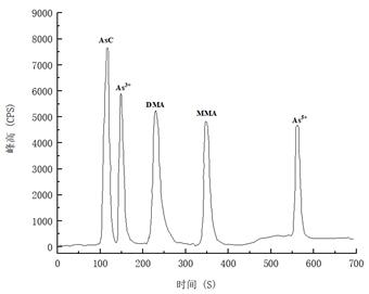 利用LC-ICPMS聯(lián)用測試河水樣品中的五種砷形態(tài),測試結果表明,該方法檢出限低、線(xiàn)性相關(guān)系數均在0.999以上,樣品加標回收率在87.8%-112.7%之間;同時(shí)五種砷形態(tài)能夠在600s內完成分析,且分離度較好,此方法可滿(mǎn)足水質(zhì)樣品中砷的形態(tài)分析。