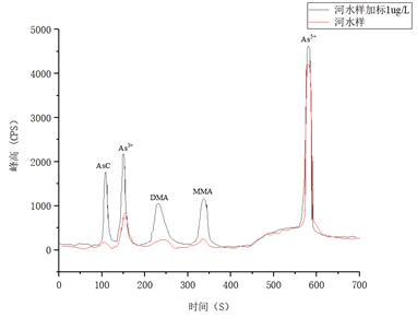 河水樣品及加標1μg/L的測試結果詳見(jiàn)表4,樣品及加標后砷形態(tài)疊加譜圖如圖5所示。