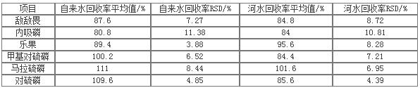 在自來(lái)水和河水中加入0.5ug 6種有機磷混標,分別作三次平行樣,按處理樣品的方法進(jìn)行樣品前處理,GC-MS 6800測試,采用外標法定量,計算其回收率,數據見(jiàn)下表: