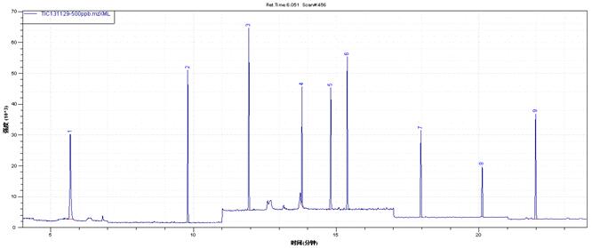 水樣經(jīng)固相萃取柱濃縮、凈化、洗脫后,氮吹定容到一定體積,過(guò)濾后樣品經(jīng)氣相色譜分離后,用質(zhì)譜進(jìn)行檢測。通過(guò)與待測目標物標準質(zhì)譜圖相比較和保留時(shí)間進(jìn)行定性,外標法定量。