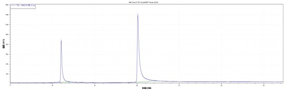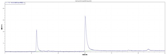 目標物在5ppm-100ppm線(xiàn)性良好。取空白食品樣品加標,樣品經(jīng)過(guò)正己烷和乙酸乙酯(1+1)超聲萃取。20ppm加標水平下譜圖如下,得到了比較滿(mǎn)意的效果。