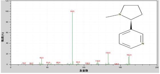 尼古。Nicotine),俗名煙堿,是一種存在于茄科植物(茄屬)中的生物堿,也是煙草的重要成分之一。尼古丁會(huì )使人上癮或產(chǎn)生依賴(lài)性,重復使用可導致心臟速度增加、血壓升高和食欲降低,攝入大劑量尼古丁會(huì )引起惡心甚至嘔吐,嚴重禍及死亡。氣相色譜質(zhì)譜聯(lián)用儀(GCMS),采用氣相色譜分離和電子轟擊電離源(EI)配合全掃描模式完成定性分析,GCMS-SIM模式實(shí)現定量分析,可應用于煙草中尼古丁的檢測。