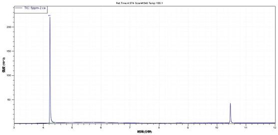 目標物在5ppm-100ppm線(xiàn)性良好。取低含量尼古丁加標,樣品經(jīng)過(guò)乙酸乙酯超聲萃取。50ppm加標水平下譜圖如下,得到了比較滿(mǎn)意的效果。
