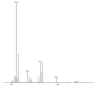 甜蜜素的主要衍生物環(huán)己醇亞硝酸酯作為定性和定量,如圖1。保留時(shí)間8.511min.定性離子(m/z)為55,81,83。定量離子為55。質(zhì)譜圖見(jiàn)圖2.