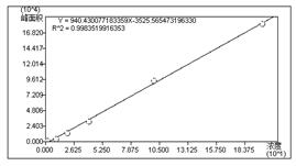準確吸取濃度為10ug/mL的甜蜜素標準溶液10ul50ml離心管中對應衍生物濃度分別為2ug/mL、10ug/mL、20ug/mL、100ug/mL、200ug/mL,按照上述標樣衍生化步驟進(jìn)行衍生化,進(jìn)行線(xiàn)性測試。實(shí)驗所得線(xiàn)性方程為:y=940.43x-3525.57,線(xiàn)性相關(guān)系數為0.9984,如圖5所示。